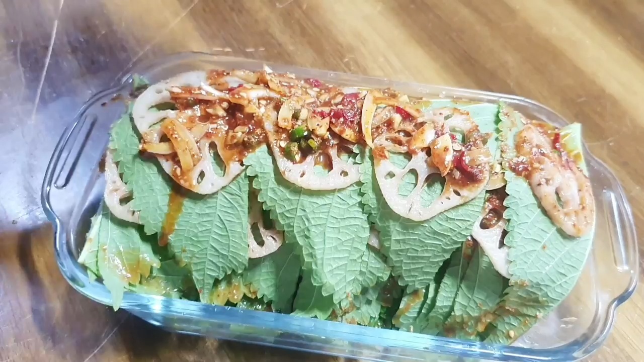 이제 통에 깻잎 반쪽을 펼치고 그 위에 바삭하게 익힌 연근을 올린 뒤 양념을 얹는다. 이 과정을 반복해 차곡차곡 쌓는다. 깻잎 특유의 향과 연근의 쫀득하면서도 바삭한 식감이 어우러진다. 매콤달콤한 양념도 전체를 감싼다. 바로 먹어도 좋고, 하루 정도 숙성하면 양념이 스며들어 감칠맛이 한층 살아난다.
