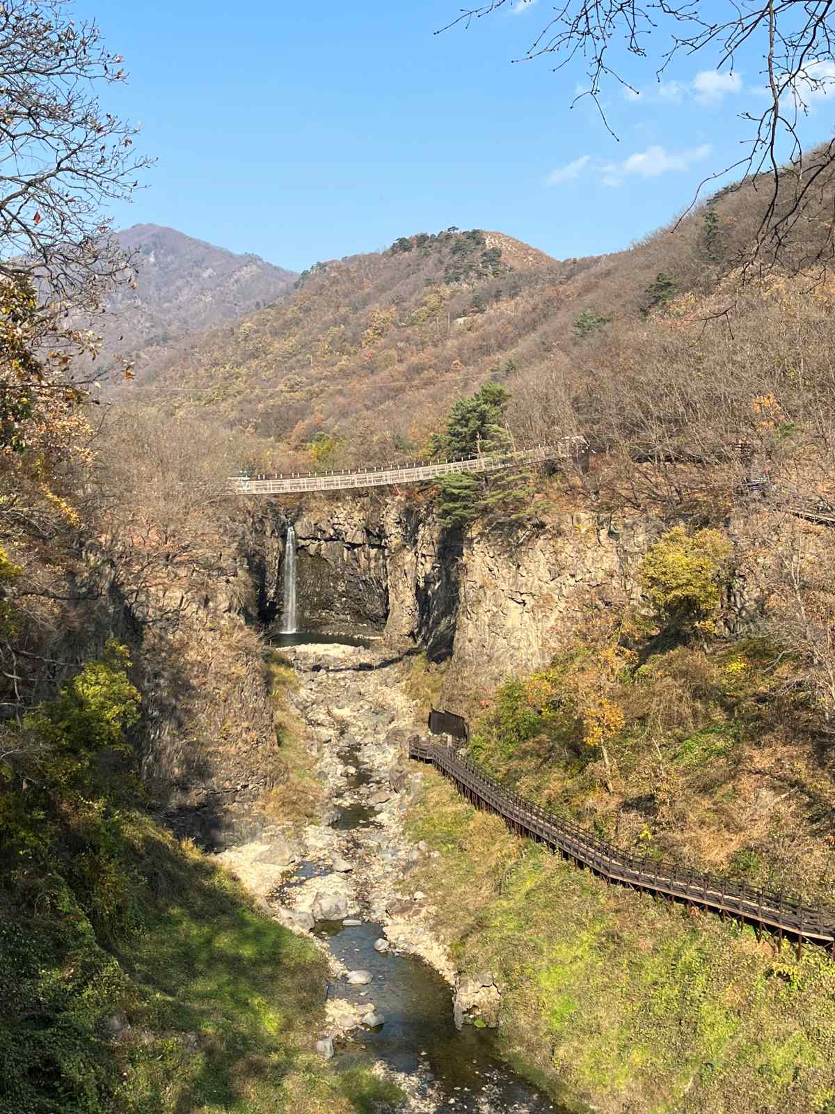 산책로 중간에는 작은 쉼터가 있어 잠시 휴식을 취할 수 있고 폭포가 가까워지면 출렁다리를 건너야 한다. 다리를 건너는 순간 발 아래로 아찔하게 흔들리는 흔들림이 스릴을 더하며 다리 중간에서는 폭포와 포트홀을 한눈에 담을 수 있는 포토존이 마련돼 있다.
