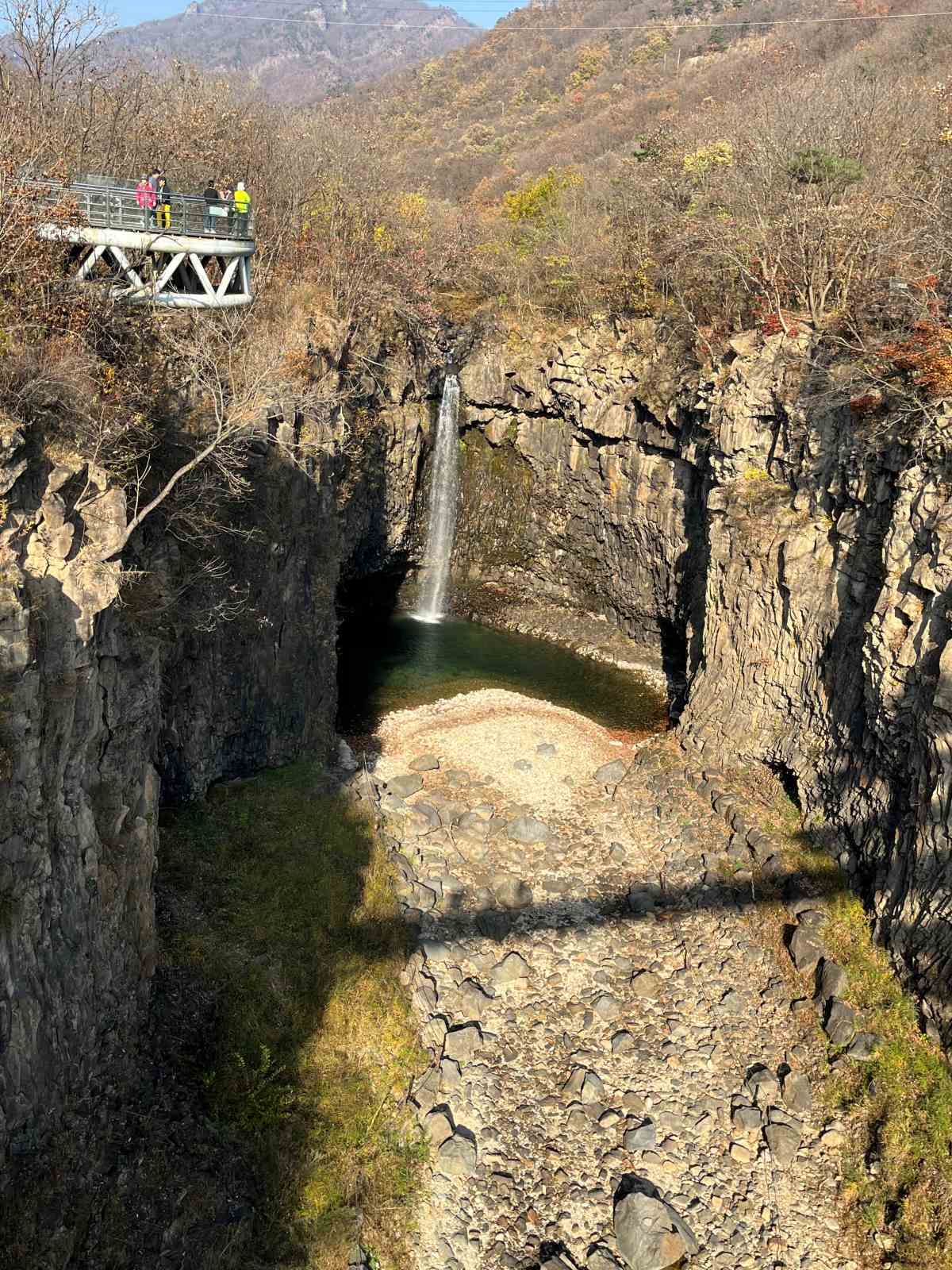 출렁다리를 건너 조금 더 올라가면 전망대가 나온다. 높은 곳에서 내려다보는 재인폭포는 폭포수와 현무암 주상절리, 포트홀이 한데 어우러져 장엄하면서도 섬세한 아름다움을 보여준다. 햇살에 비친 폭포를 바라보면 자연이 만들어낸 조형미를 그대로 감상할 수 있다.