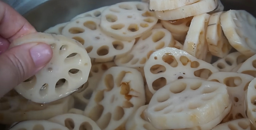 썬 연근은 갈변을 막기 위해 식초를 약간 푼 물에 10분 정도 담가둔다. 이 과정은 떫은맛을 줄이는 데도 도움이 된다. 이후 흐르는 물에 헹궈 전분기를 일부 제거한다. 다만 너무 오래 씻으면 쫀득한 식감을 만드는 전분까지 빠질 수 있으므로 1~2회 가볍게 헹구는 정도로 마무리한다.