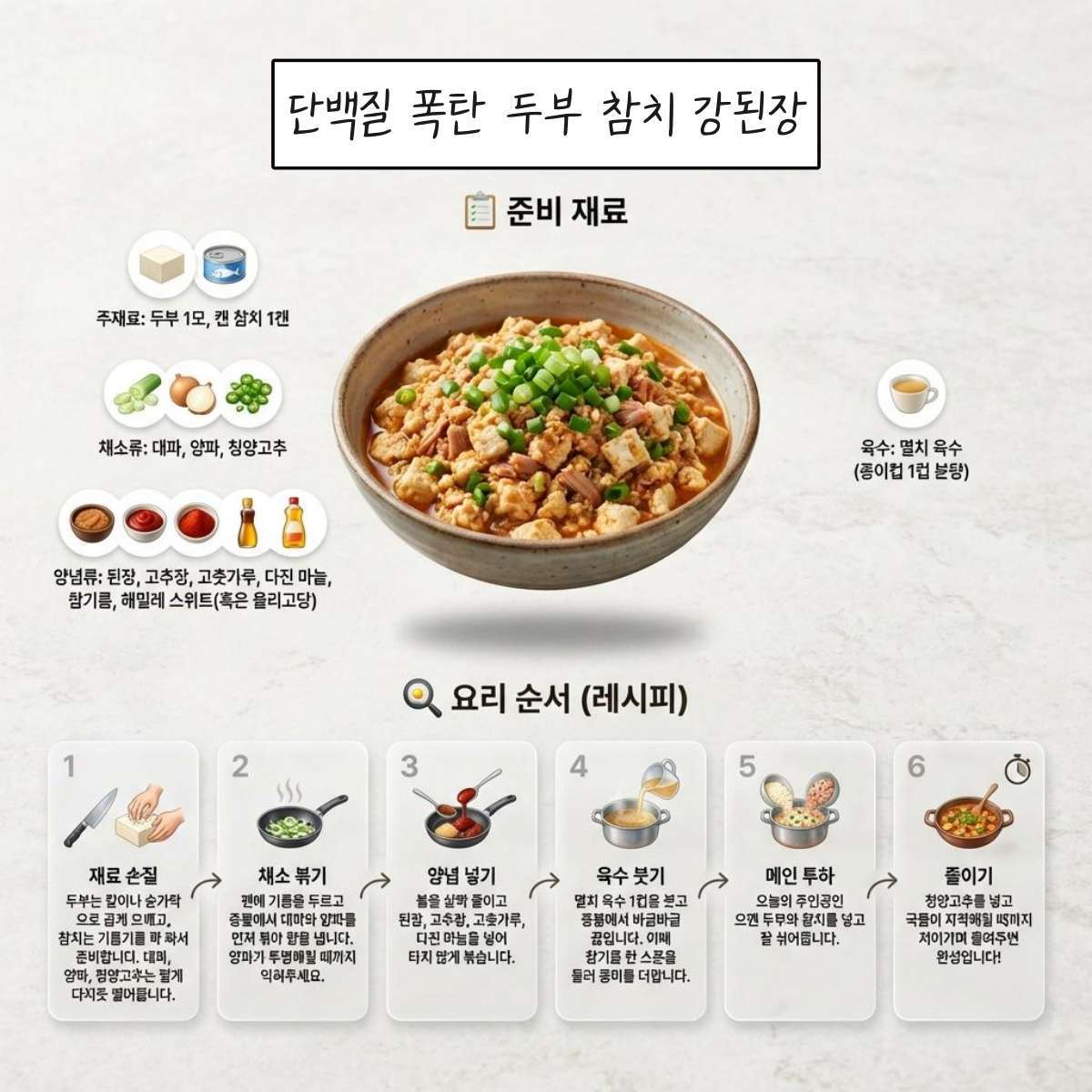 특별한 기술 없이도 완성도 높은 한 끼가 만들어진다. 두부 1모와 참치 1캔을 나란히 넣는 것만으로도 단백질 중심의 밥상이 완성된다. 고기 없이도 든든한 한 끼를 찾는다면, 냉장고 속 두부와 참치를 꺼내보는 것으로 충분하다.