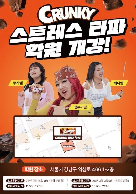 크런키 특유의 바삭한 식감이 주는 쾌감을 스트레스 타파와 연결해, 학업으로 지친 학생들에게 크런키를 통한 일상의 활력을 선사한다는 계획이다. 팝업 장소도 학생들의 공감을 극대화하기 위해 학원가로 유명한 대치동을 선정했다.