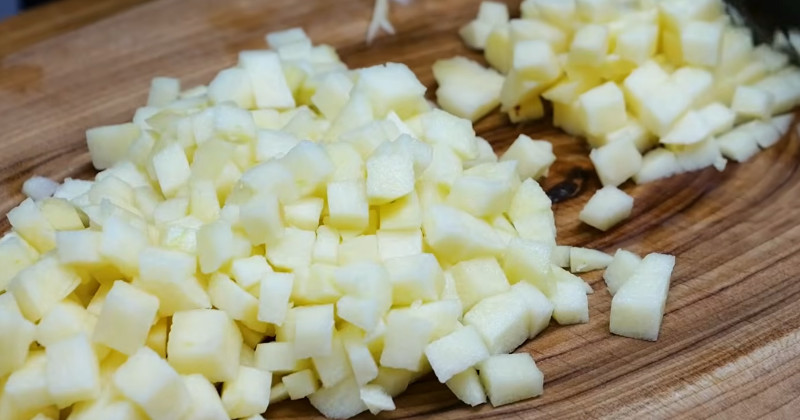 식감이 남는 잼을 원한다면 0.5센치 정도의 작은 깍둑썰기가 적당하다. 완전히 부드러운 질감을 원한다면 0.3센치 이하로 더 잘게 썬다. 껍질은 벗기지 않아도 된다. 껍질에는 펙틴이 풍부해 잼이 더 잘 응고된다. 대신 깨끗이 세척한 뒤 물기를 충분히 제거해야 잡맛이 나지 않는다. 사과 4개 기준으로 손질 후 무게는 약 800그램 안팎이 적당하다.
