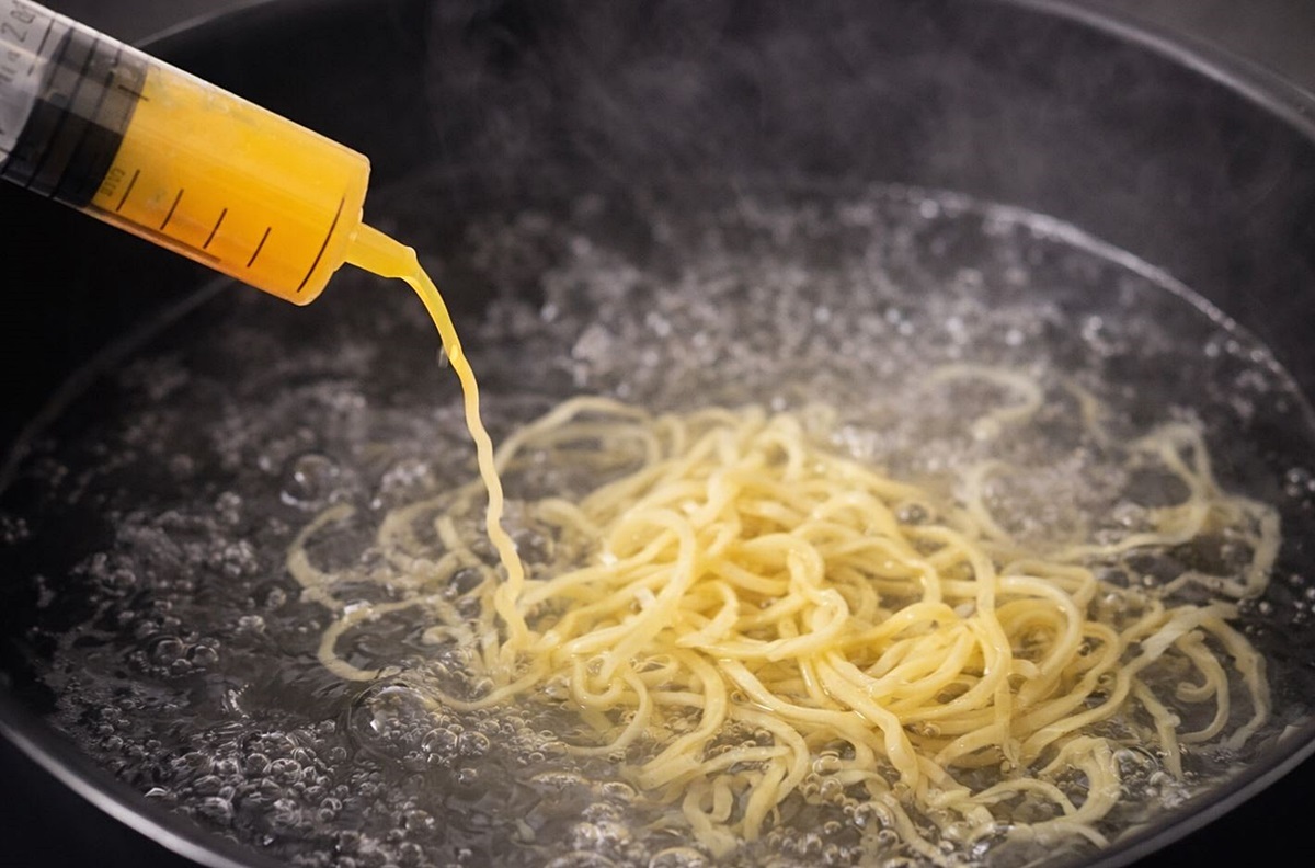 원리는 의외로 간단하다. 계란 속 액체를 가느다란 줄로 뽑아 뜨거운 물에 흘려 넣으면 단백질이 열을 만나 빠르게 응고하면서 실처럼 길게 굳어져 면발 같은 형태가 만들어진다.