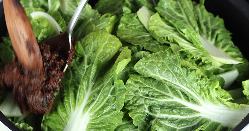 양념이 끓어오르면 물 300ml를 붓고 고루 풀어준다. 된장이 덩어리지지 않도록 잘 저어가며 끓인다. 국물이 한소끔 끓기 시작하면 손질한 봄동을 한꺼번에 넣는다. 처음에는 양이 많아 보이지만 금세 숨이 죽는다. 뚜껑을 덮고 중약불에서 7~10분 정도 푹 지진다.