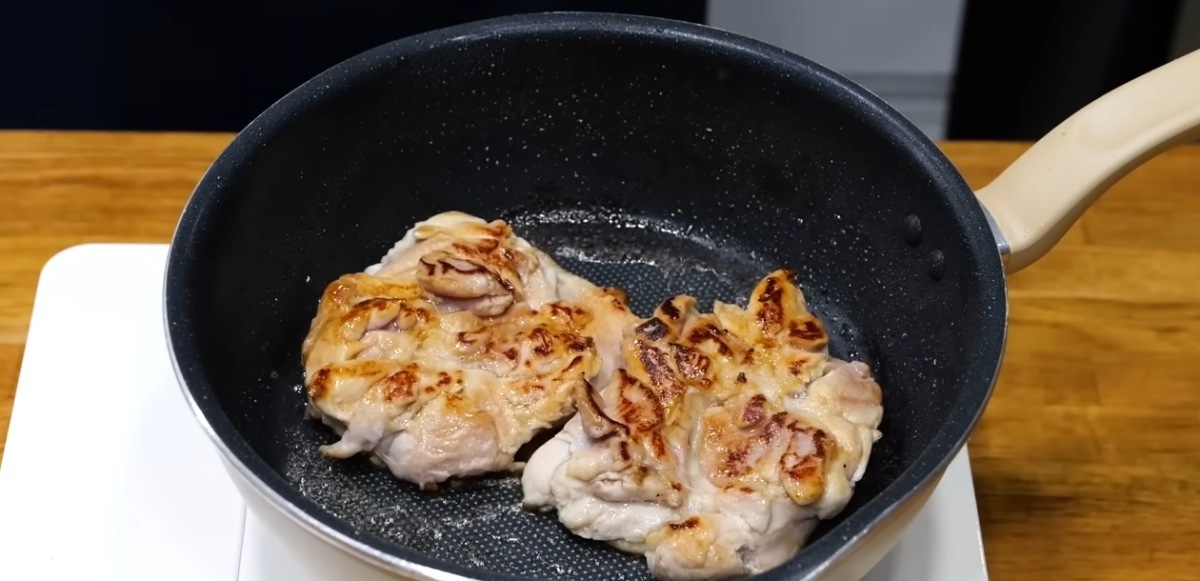 팬에 식용유 한 스푼을 두르고 닭다리살을 껍질 쪽부터 강불로 구워준다. 닭다리살이 익으면 가스불을 약하게 하고 먹기 좋은 크기로 잘라준다.