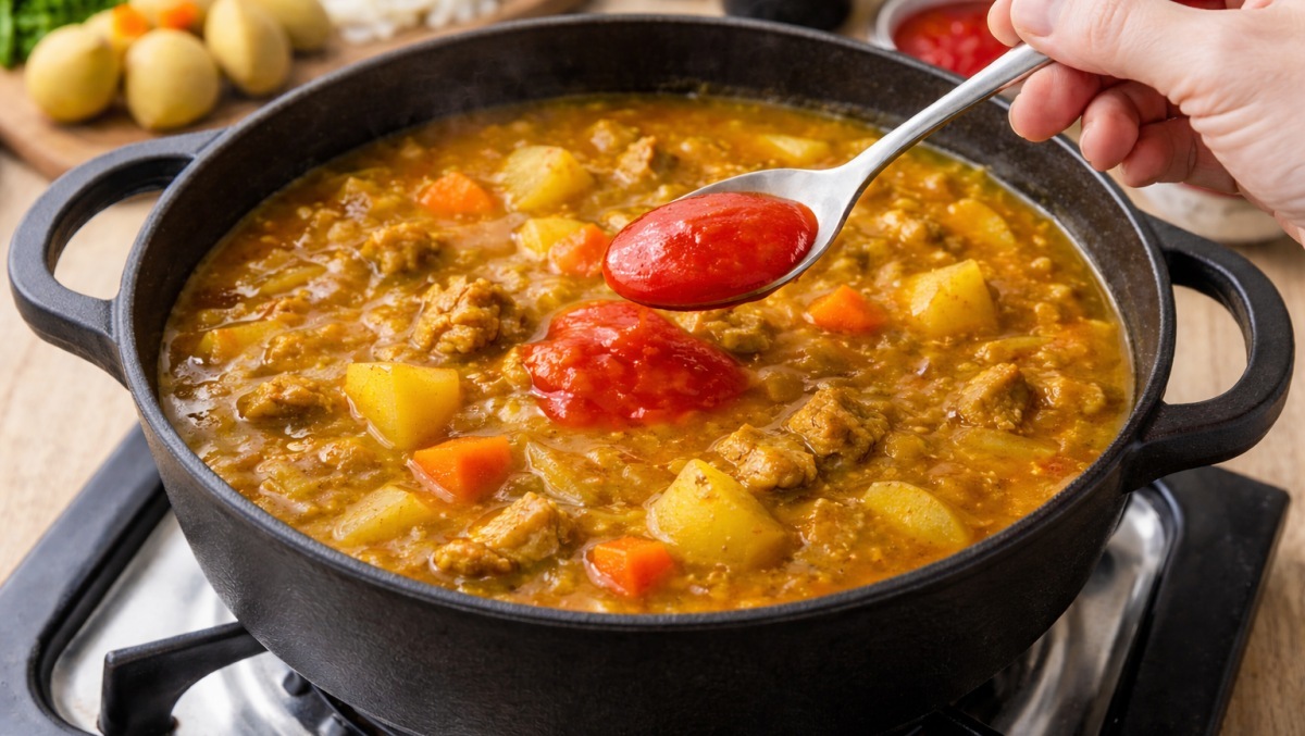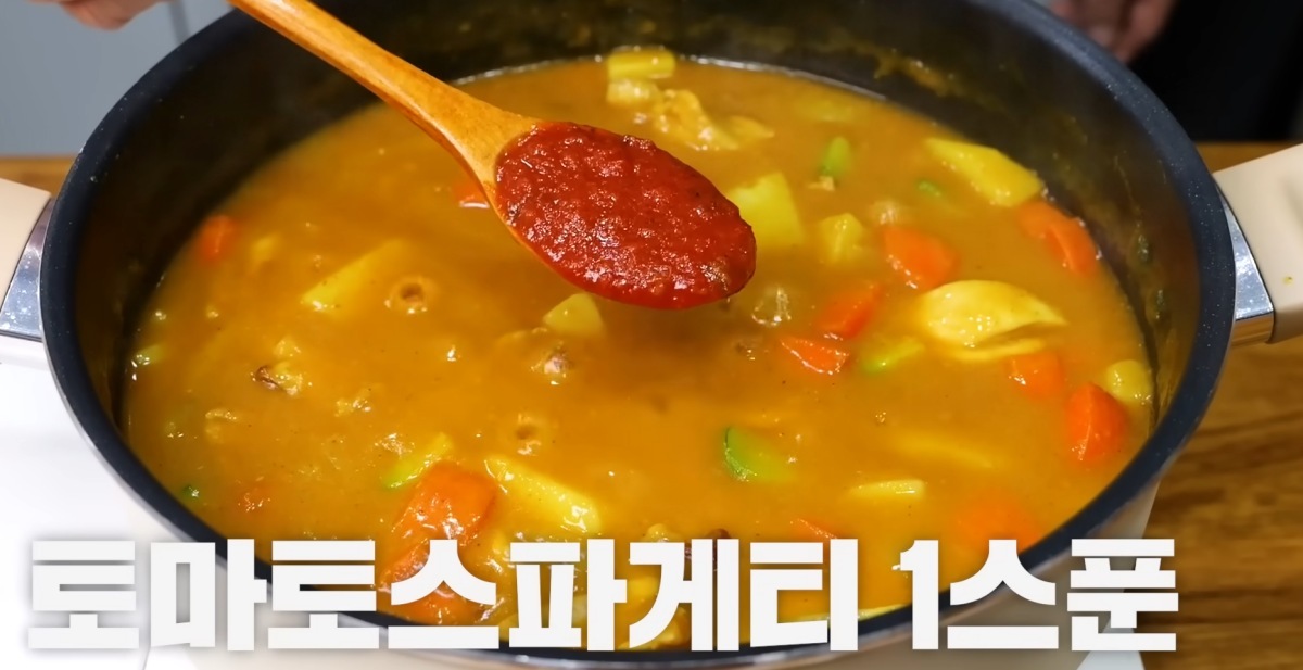 마지막 과정에서 토마토소스를 넣을 때 "이게 가능할까?"라는 생각이 들 수도 있다. 카레와 토마토소스는 사실 상상하기 어려운 조합이다. 하지만 토마토에는 천연 감칠맛 성분인 글루탐산이 풍부하다. 카레에 토마토의 미세한 산미와 감칠맛이 더해지면 맛이 더욱 깊어진다.
