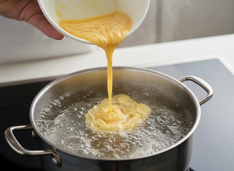 이제 계란을 준비할 차례다. 계란은 완전히 풀기보다는 흰자와 노른자가 적당히 섞인 상태로 준비한다. 국물이 팔팔 끓을 때 불을 중약불로 줄이고, 한 손으로 천천히 계란물을 부으면서 다른 손으로 젓가락이나 국자로 부드럽게 원을 그리듯 저어준다. 그러면 국물 속에 꽃처럼 퍼지는 계란 물결이 만들어진다. 이때 너무 세게 저으면 국물이 탁해지므로 주의한다.