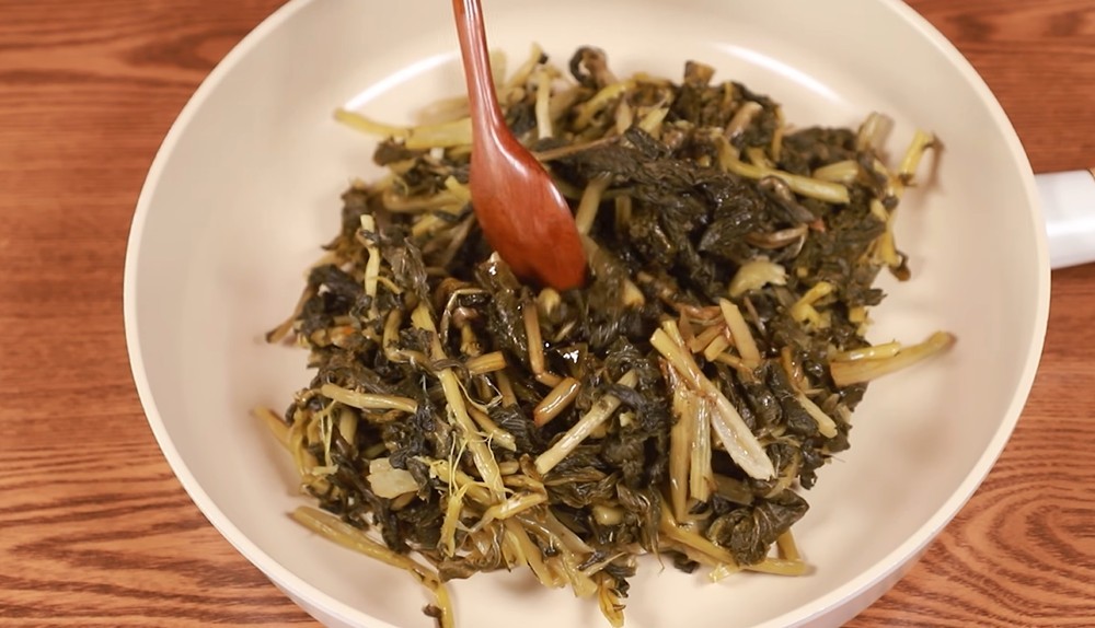 팬에 들기름 두 큰술을 두르고 약불에서 마늘 향이 은은하게 올라오도록 볶는다. 이후 밑간한 시래기를 넣고 중불에서 천천히 볶는다. 처음에는 수분이 적어 퍽퍽하게 느껴질 수 있지만, 볶다 보면 시래기에서 자연스럽게 수분이 나오며 부드러워진다. 이때 물이나 다시마 육수를 서너 큰술 넣고 뚜껑을 덮어 3분 정도 뜸을 들이면 한층 촉촉해진다. 마지막에 통깨를 뿌리고 참기름을 약간 더하면 고소함이 살아난다.