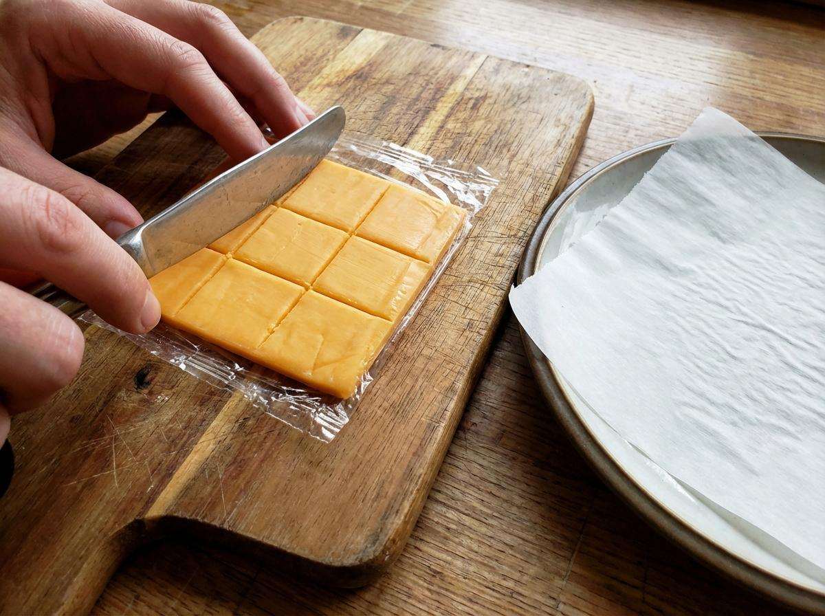 방법은 단순하다. 체다 슬라이스 치즈를 가로·세로 3등분해 9조각으로 자른다. 더 작게 먹고 싶다면 6~16등분으로 나눠도 된다. 자를 때는 비닐을 벗기기 전 칼등이나 스크래퍼로 눌러 선을 잡으면 모양이 깔끔하다. 이후 비닐을 제거하고 준비한다.