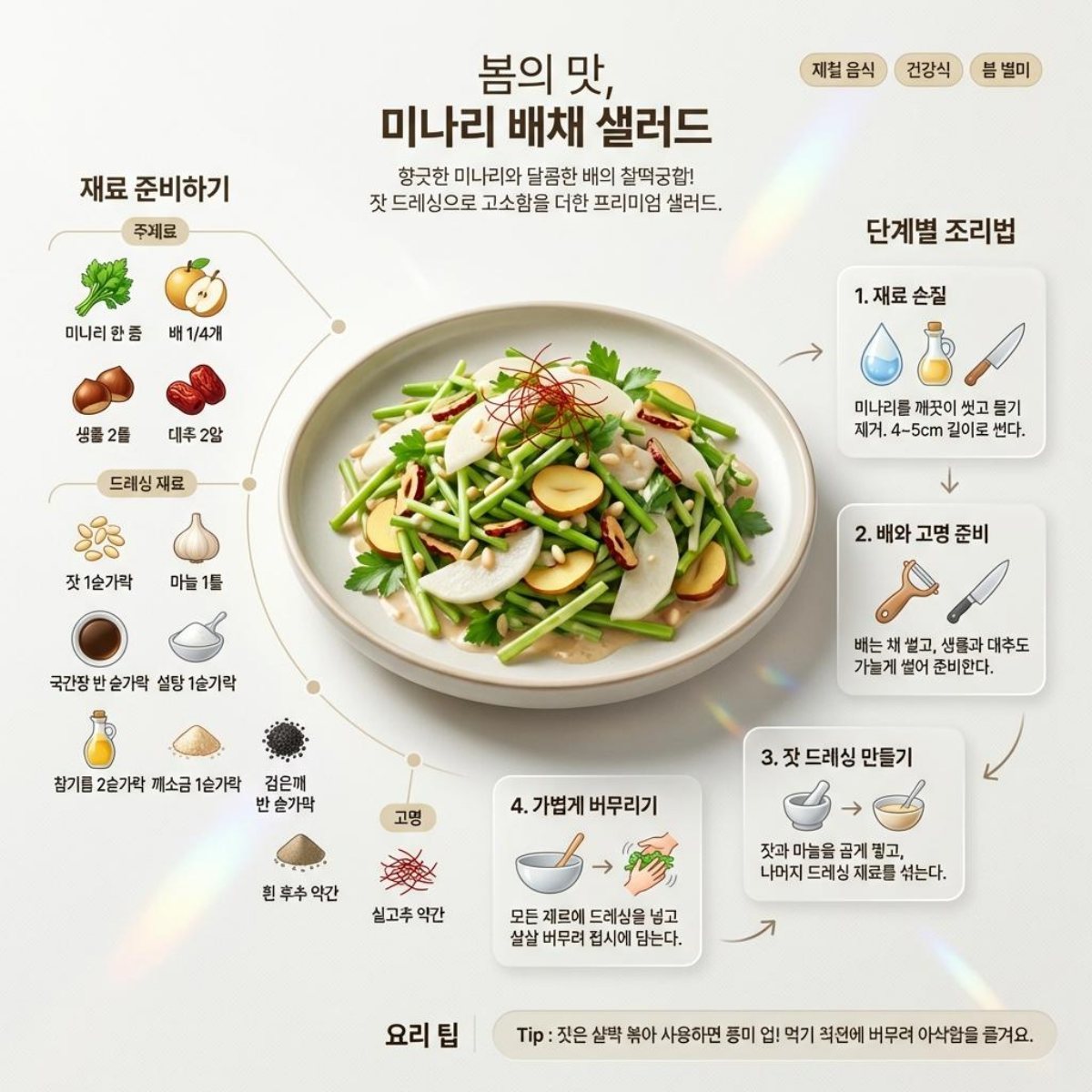 더 맛있게 즐기기 위한 몇 가지 팁이 있다. 드레싱에 들어가는 잣은 마른 팬에 살짝 볶아서 사용하면 고소한 풍미가 훨씬 진해진다. 또한, 바로 먹기 직전에 버무리는 것이 가장 좋다. 시간이 지나면 배와 미나리에서 수분이 나와 드레싱이 묽어지고 아삭함이 줄어들기 때문이다.