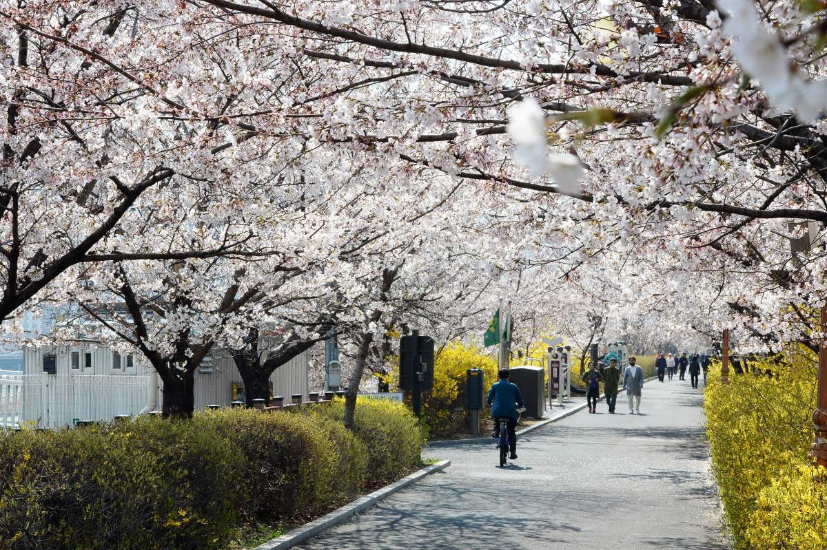 한강 변을 따라 길게 늘어선 벚나무들은 규모와 밀도 면에서 단연 눈에 띈다. 도로 양옆으로 가지가 맞닿으며 긴 벚꽃 터널을 만든다. 낮에는 한강 수면과 맞닿은 시원한 풍경이 펼쳐지고, 강바람이 불 때마다 꽃잎이 흩날린다. 강변 특유의 탁 트인 공간감 덕분에 답답함이 덜하다.