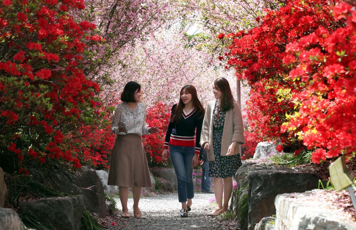 4월 중순 이후에는 철쭉이 뒤이어 핀다. 붉은빛과 진분홍, 흰색 철쭉이 겹겹이 올라오며 서부해당화와 어우러진다. 색감이 층을 이루며 공간 전체를 채운다. 사찰 건축물과 꽃이 맞물리면서 화려함과 차분함이 동시에 느껴진다.