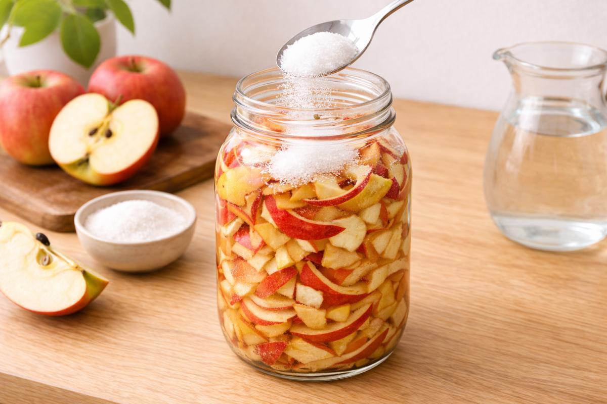 제조 과정은 다음과 같다. 먼저 소독된 유리병에 사과 껍질을 가득 채워 넣는다. 그 위에 설탕 두 스푼을 추가하는데, 이는 미생물의 먹이가 되어 발효를 촉진하는 핵심적인 역할을 한다. 이후 껍질이 충분히 잠길 정도로 물을 붓고 내용물을 골고루 섞어준다. 보관 시에는 직사광선을 피하고 통풍이 잘되는 어두운 곳에 두어야 한다. 약 30일 정도의 발효 기간을 거치면 액체의 산도가 높아지며 식초의 형태를 갖추게 된다. 한 달 뒤 껍질을 걸러내고 액체만 따로 보관하면 요리의 드레싱이나 청소용 천연 세정제로 활용할 수 있는 사과 식초가 완성된다.