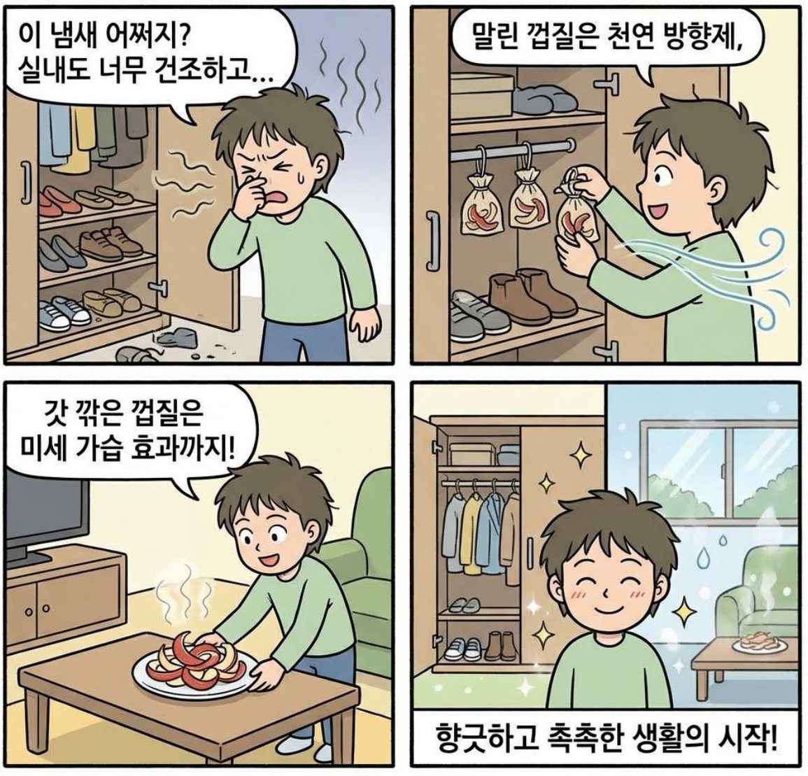 어려운 조리법이나 복잡한 원리 대신, 누구나 집에서 바로 따라 할 수 있는 친근하고 쉬운 방법들이 우리 주방의 풍경을 더욱 건강하고 깨끗하게 바꿔줄 것이다. 이번에는 가족과 함께 사과를 나누어 먹은 뒤 남은 껍질을 버리지 말고 식탁 위에 잠시 남겨 보자.