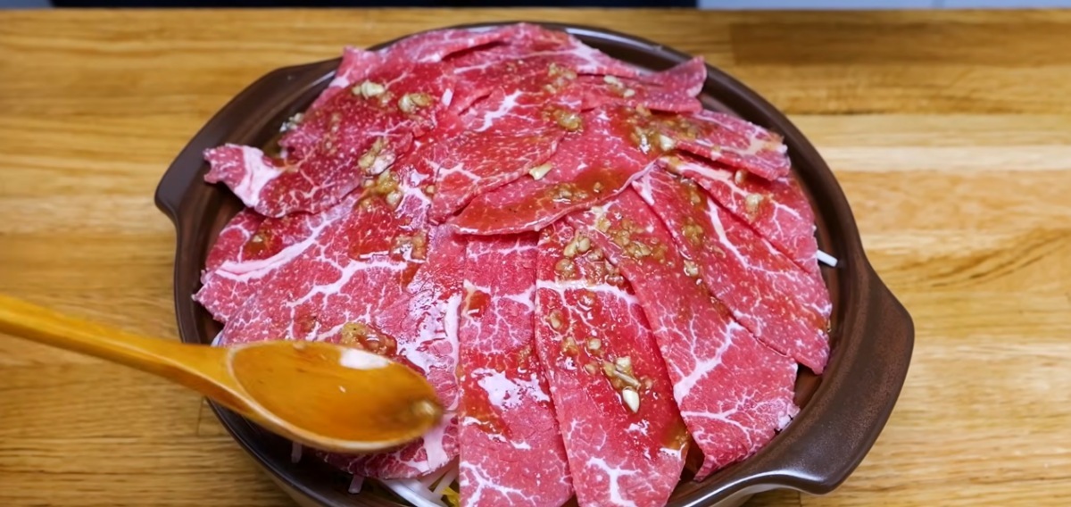 이후 명절에 육전을 만든 후 남은 소고기 우둔살을 준비한다. 이때 소고기 말고도 돼지고기를 활용해도 무관하다. 먹기 좋게 반으로만 잘라주면 된다. 소고기에 소금을 세 꼬집 정도 뿌려 간을 맞춘 후 준비한 채소 위에 차곡차곡 올려준다.