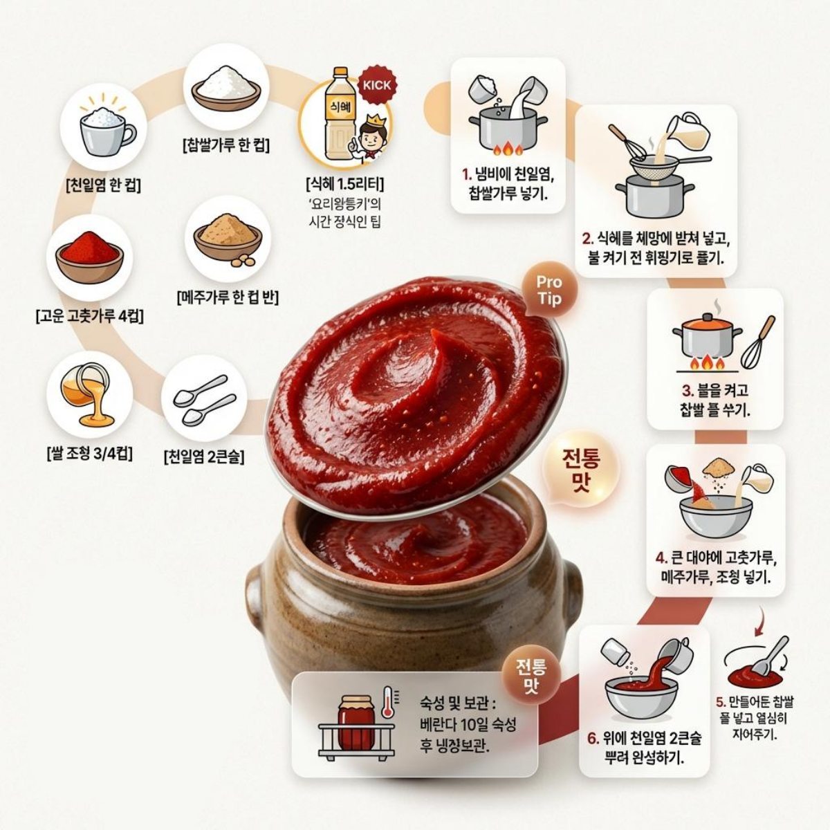 레시피의 시작은 기초 재료 준비에서 출발한다. 먼저 적절한 크기의 냄비에 천일염 한 컵과 찹쌀가루 한 컵을 계량하여 넣는다. 이 레시피의 가장 핵심적인 비법이자 이른바 '킥'으로 지목된 재료는 다름 아닌 '식혜'다. '1분요리왕 통키'는 식혜를 이용할 경우 고추장 제조에 들어가는 물리적인 시간과 노력을 단축할 수 있다고 강조하며 식혜 1.5리터를 준비할 것을 권장했다.