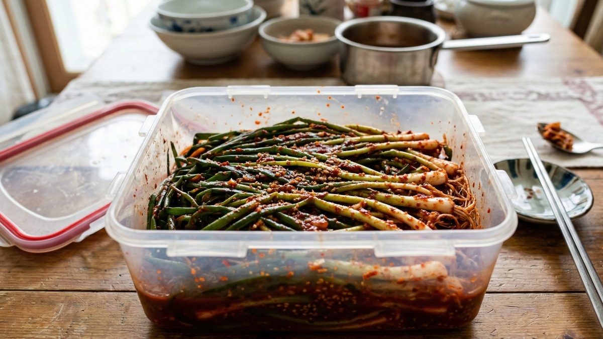 마지막으로 들기름 한 스푼을 둘러 고소함을 더한다. 이후 통깨를 뿌리면 완성이다. 들기름은 향을 한층 끌어올리는 동시에 매운맛을 부드럽게 감싸준다. 완성된 파김치지짐은 국물이 자작하게 남아 있어 숟가락을 부르게 한다. 흰쌀밥 위에 올려 비벼 먹으면 양념이 밥알 사이사이에 스며들어 한 그릇이 금세 비워진다.