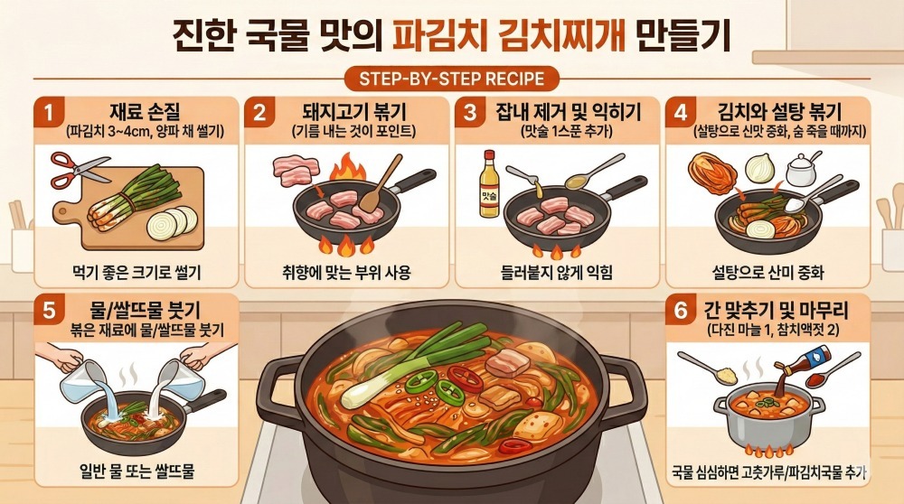 시어 가는 파김치. 한때는 밥 위에 올리기만 해도 식욕을 자극하던 반찬이지만, 시간이 지나면 신맛이 강해져 젓가락이 쉽게 가지 않는다. 그렇다고 버리기엔 아깝고, 그대로 두자니 애물단지처럼 느껴질 때가 있다. 이럴 때 가장 확실한 해결책은 뜨끈한 김치찌개다. 잘 익은 파김치의 깊은 맛을 살려 한 그릇 제대로 끓여 내면, 묵은 파김치를 다시 보게 된다.
