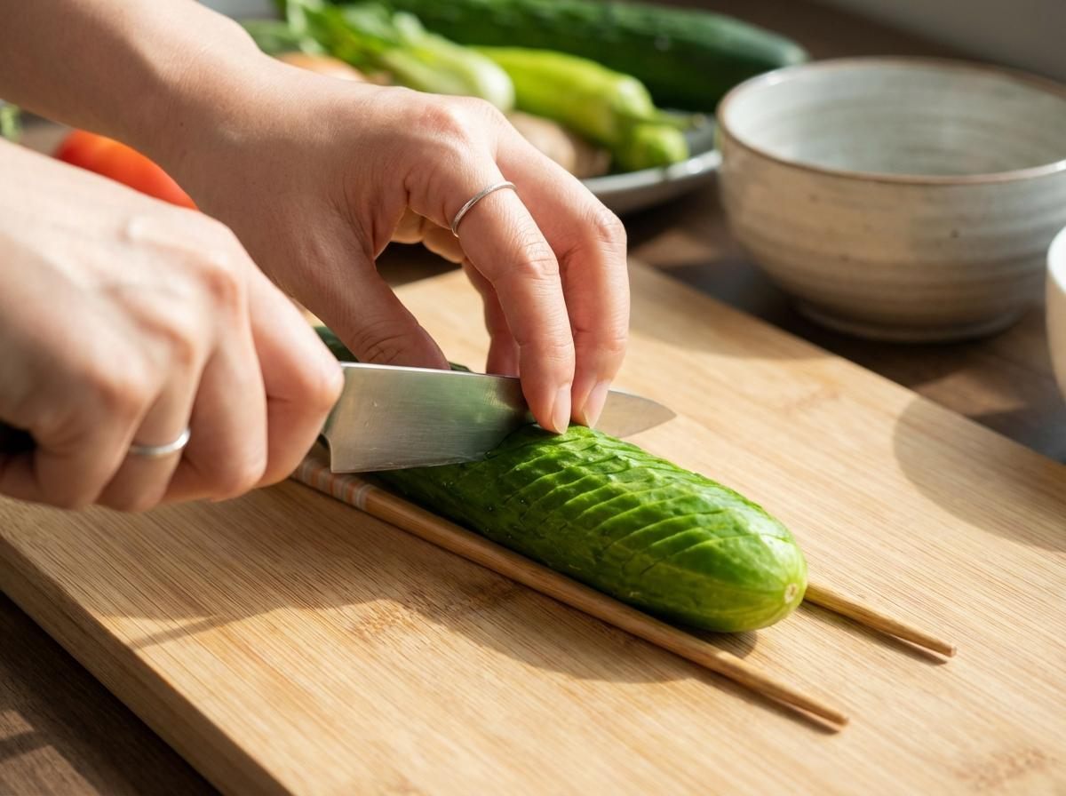 이 과정에서 많은 이들이 궁금해하는 부분은 오이가 끊어지지 않는 이유다. 나무젓가락이 물리적 받침 역할을 하면서 칼날 깊이를 일정하게 제한하기 때문에, 칼집은 촘촘히 들어가되 중심부는 연결된 상태로 유지된다. 칼을 힘으로 조절하는 대신 도구로 깊이를 제어하는 방식이다.