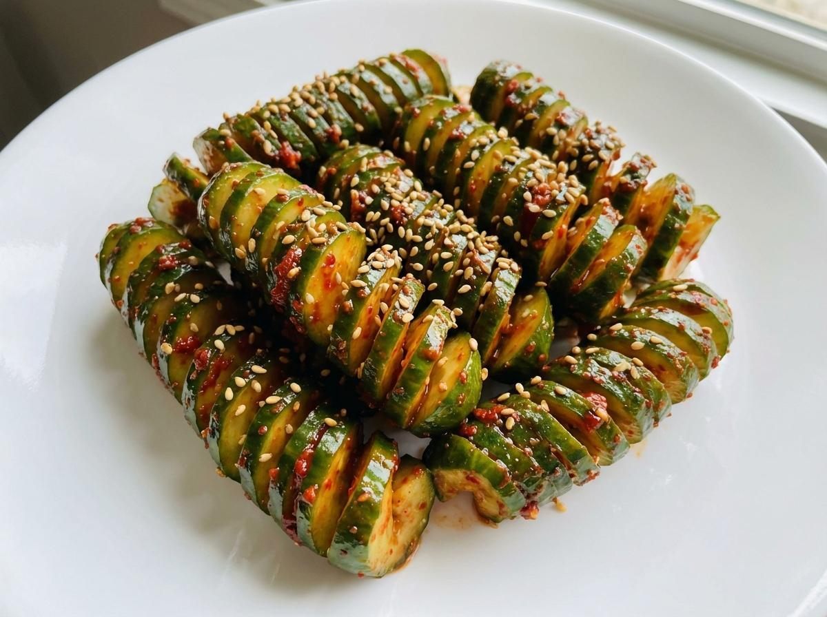 칼집 사이로 붉은 양념이 촘촘히 스며들어 보기에도 화려하고, 한입 베어 물면 양념이 고르게 퍼진다. 단순한 오이무침이지만 모양 하나로 식탁 분위기가 달라진다. 집들이나 손님상에서 반찬가게에서 산 듯한 비주얼을 연출할 수 있다는 점도 매력이다.