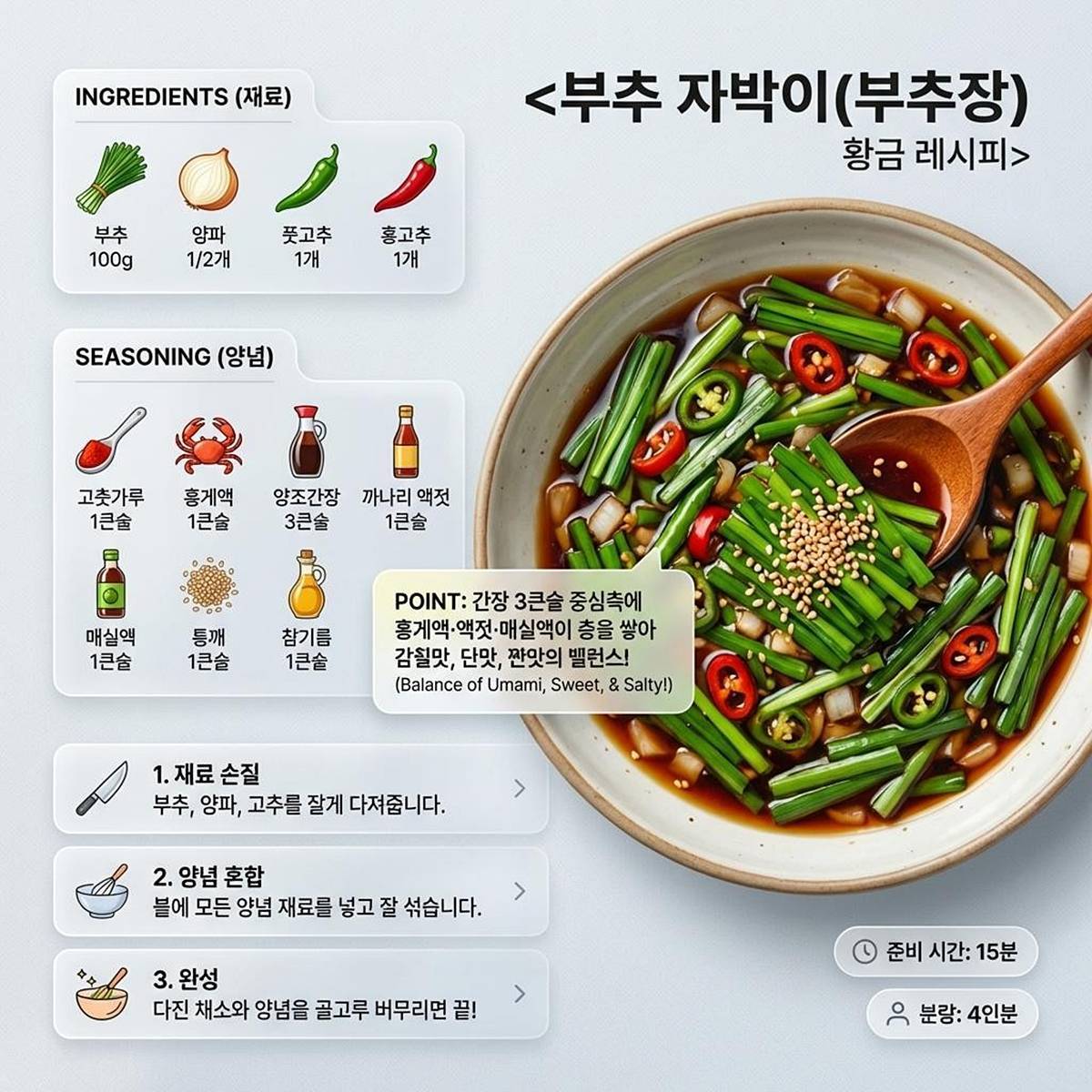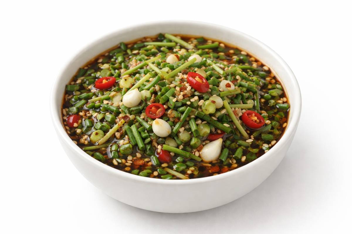 만드는 과정도 직관적이다. 양파 반 개는 입자가 느껴지도록 다지고, 부추 100g은 약 0.56cm 길이로 썬다. 풋고추와 홍고추도 각각 1개씩 다져 준비한다. 믹싱볼에 양조간장 3큰술과 홍게액 1큰술, 까나리 액젓 1큰술, 매실액 1큰술을 넣고 고춧가루 1큰술, 통깨 1큰술을 섞는다. 마지막으로 참기름 1큰술을 더해 양념장을 완성한 뒤, 손질한 부추·양파·고추를 넣고 버무리면 끝이다.