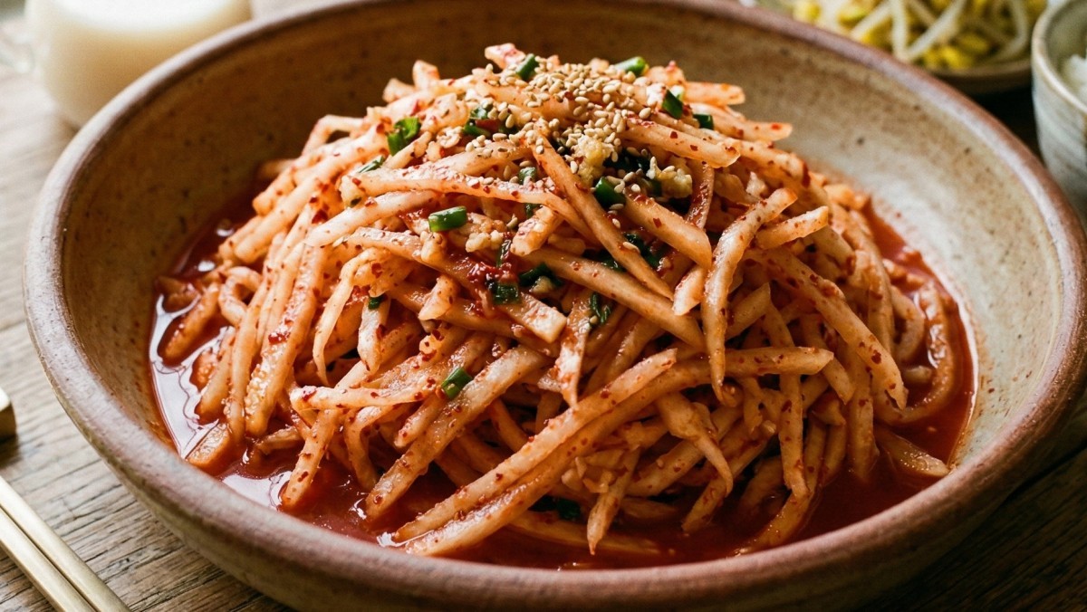 먼저 무를 일정한 굵기로 채 썬다. 너무 얇으면 숨이 금방 죽어 아삭한 맛이 사라지므로 적당한 두께를 유지하는 것이 좋다. 채 썬 무에 고춧가루를 먼저 넣고 버무려 무에 붉은 색을 입힌다. 그다음 다진 마늘과 액젓으로 간을 맞춘다.