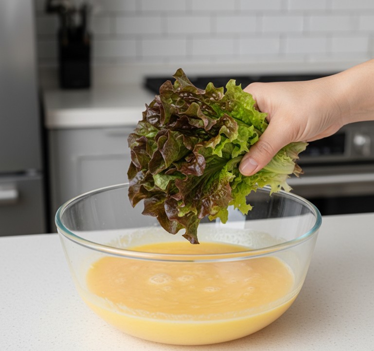 1단계는 상추 손질이다. 흐르는 물에 깨끗이 씻은 뒤 물기를 완전히 제거한다. 물기가 남아 있으면 계란물이 묽어지고 모양이 흐트러진다. 키친타월로 톡톡 두드려 말린 뒤, 굵은 줄기는 도려내고 잎 부분만 1cm 폭 정도로 가늘게 채 썬다. 너무 잘게 다지면 식감이 사라지므로 ‘결이 느껴질 정도’로 써는 것이 핵심이다.