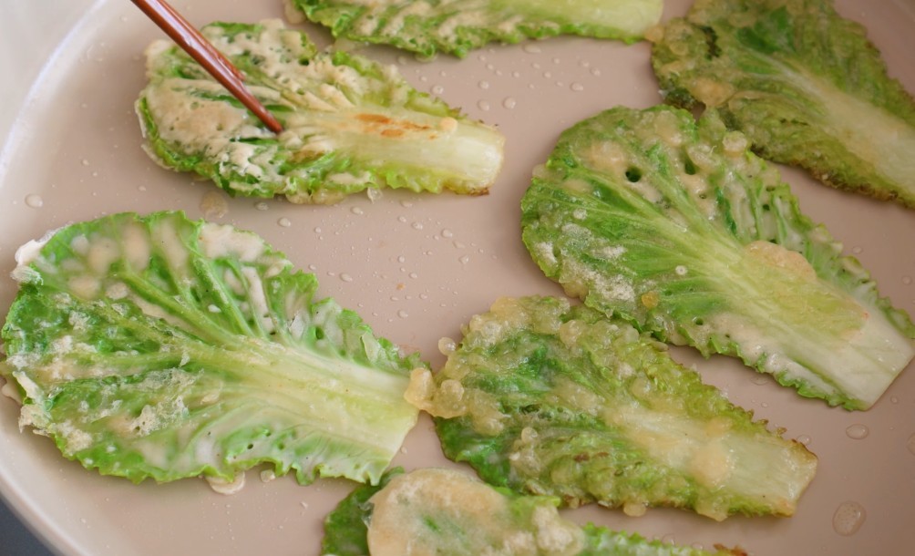 팬을 충분히 달군 뒤 식용유를 넉넉히 두른다. 바삭하게 하려면 기름을 아끼지 않는 것이 중요하다. 봄동을 반죽에 가볍게 담갔다가 팬에 펼친다. 한 장씩 넓게 펴야 수분이 빠르게 증발한다. 중강불에서 시작해 가장자리가 노릇해지면 중불로 낮춘다. 뒤집은 뒤에는 팬 가장자리에 기름을 조금 더 둘러준다.