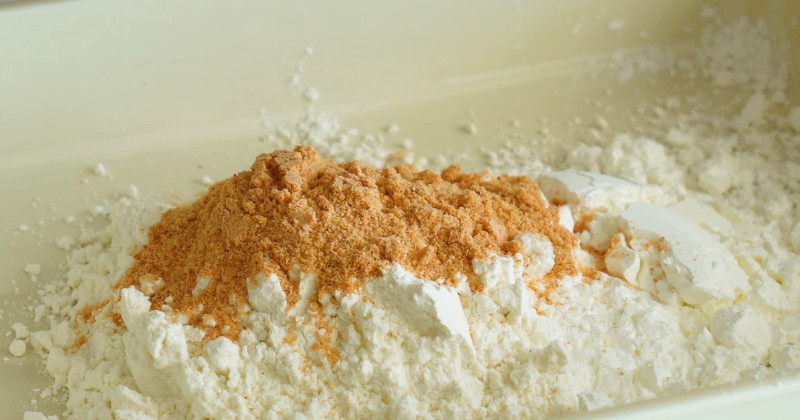 먼저 밀가루와 전분의 비율이다. 밀가루 8T에 전분 5T를 섞으면 글루텐 형성이 줄어든다. 밀가루만 사용하면 글루텐이 많이 생겨 쫀득해지지만, 전분이 들어가면 겉면이 더 건조하고 얇게 튀겨지듯 익는다. 전분은 수분을 빠르게 날려 표면을 단단하게 굳혀주기 때문에 ‘바삭’한 식감을 만든다.