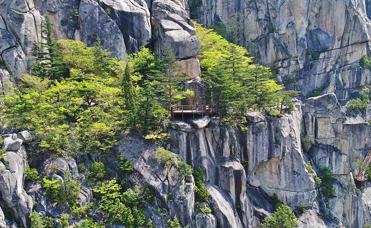 산 중턱 해발 470m 지점에 위치한 마천루는 두타산 비경의 결정체다. 깎아지른 듯한 암릉과 기암절벽이 겹겹이 에워싼 모습은 마치 빌딩 숲을 연상시킨다. 금강산 바위 위로 아슬아슬하게 조성된 잔도 데크 길을 따라 걷다 보면 두타 협곡의 광활한 풍광이 한눈에 들어온다. 거대한 바위들이 숲처럼 솟아오른 이 풍경은 '한국의 장가계'라는 별칭에 걸맞게 압도적인 시각적 경험을 선사한다. 발 아래로 펼쳐지는 아찔한 낭떠러지와 주변의 기암괴석이 어우러진 모습은 자연이 억겁의 시간 동안 조각한 예술 작품이나 다름없다.