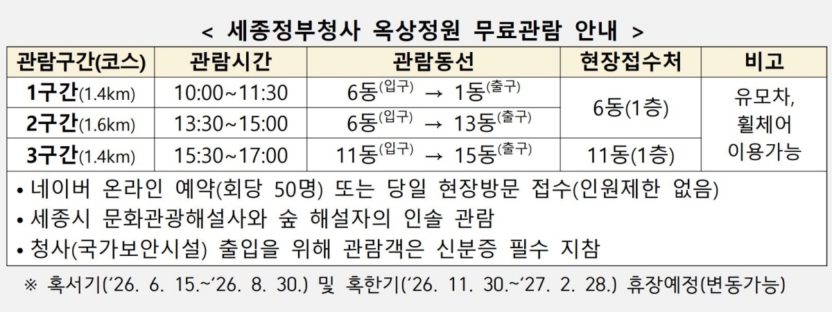 정부세종청사 옥상정원 관람 관련 자세한 정보는 정부청사관리본부 누리집과 네이버 스마트플레이스 ‘정부세종청사 옥상정원’에서 확인할 수 있다.