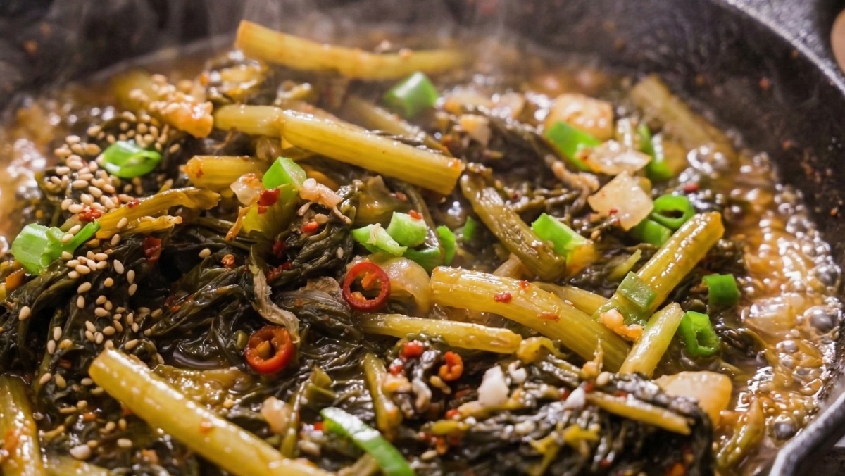 이제 뚜껑을 덮고 중약불에서 천천히 졸여준다. 시간이 지나며 국물이 서서히 줄어들고 열무김치에 양념이 스며들면서 깊은 맛이 만들어진다. 조금 더 매콤한 맛을 원한다면 이 과정에서 청양고추를 추가해도 좋다. 김치가 부드러워지고 양념이 잘 어우러졌다면 불을 끈다.