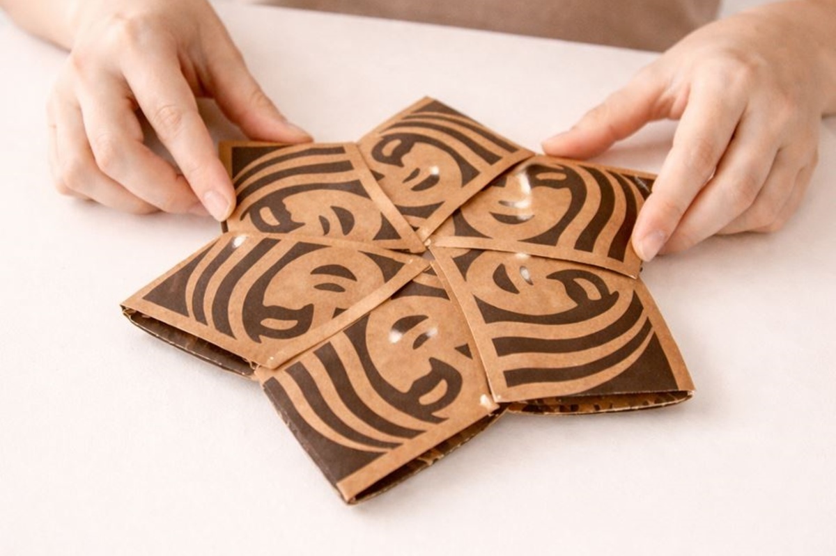 만드는 방법은 어렵지 않다. 준비물은 커피 컵홀더 6개다. 컵홀더를 모두 같은 방향으로 놓은 뒤 컵홀더의 홈을 서로 끼워 연결해 주면 된다. 하나씩 이어 붙이듯 결합해 원형에 가깝게 모아 주면 가운데가 비어 있는 별 모양이 만들어진다. 이 형태가 바로 냄비받침 역할을 한다.