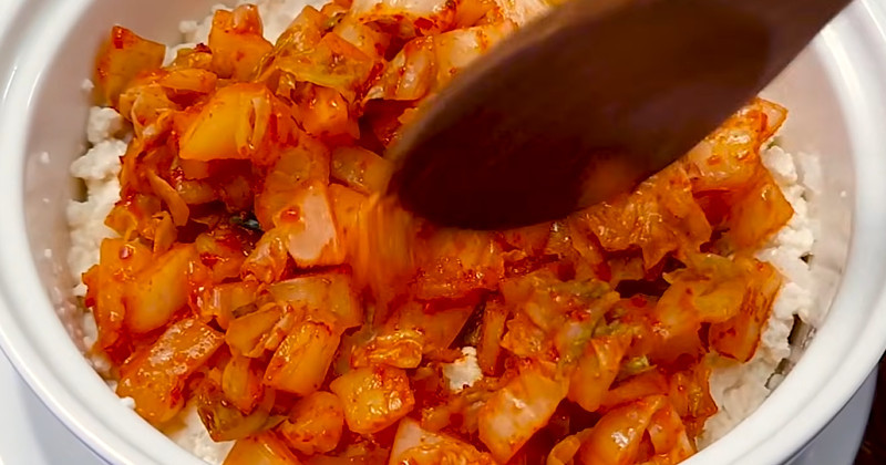 전자레인지에서 꺼낸 뒤에는 숟가락으로 가볍게 섞어 준다. 밥과 묵은지, 두부가 골고루 섞이도록 비벼 주면 두부 김치밥이 완성된다. 이때 김치의 붉은 양념이 밥에 자연스럽게 섞이면서 먹음직스러운 색이 된다.