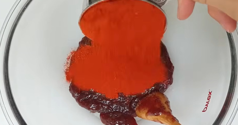 볼에 고추장을 먼저 넣고 딸기잼을 넣어 잘 섞어 준다. 이때 잼의 양을 조금씩 조절하면서 섞으면 자신의 입맛에 맞는 단맛을 찾기 좋다. 잼이 들어가면서 고추장의 질감이 부드러워지고 색도 조금 더 밝아진다.