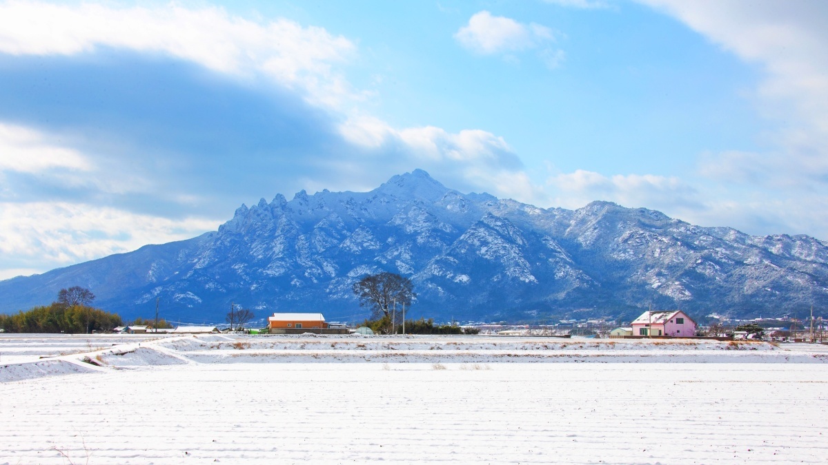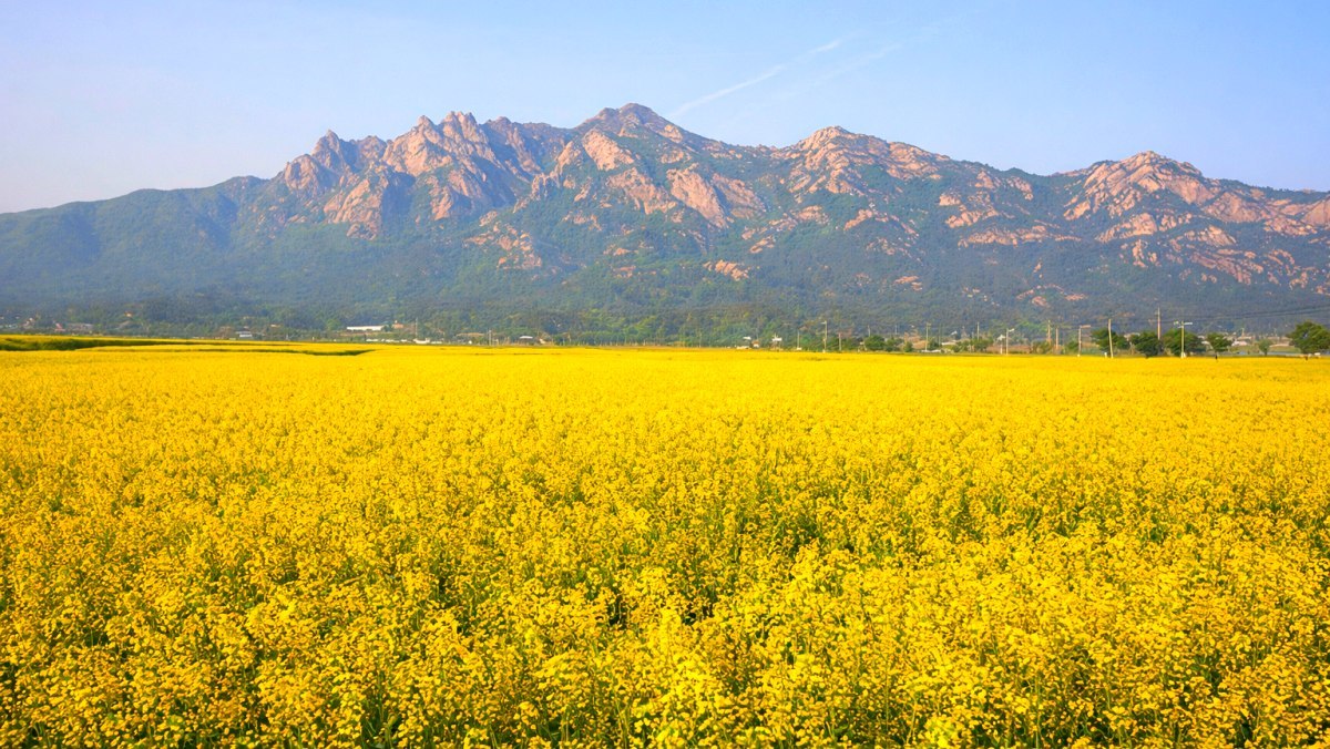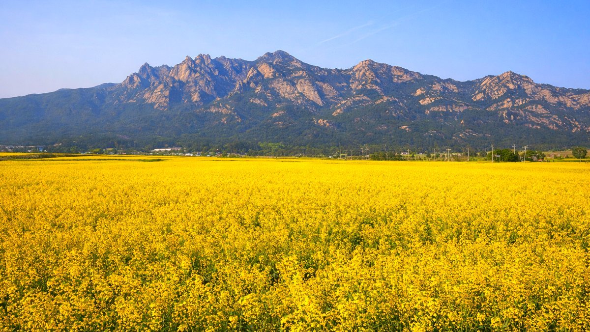 전남 영암 월출산 유채꽃단지다. 이곳에선 약 100만 평에 달하는 면적에 끝없이 펼쳐진 노란 지평선을 감상할 수 있다. 축구장 약 460개를 합친 크기와 비례한 이곳은 단일 면적으로는 전국 최대 규모 중 하나로 꼽힌다. 특히 호남의 소금강이라고 불리는 월출산의 기암괴석을 배경으로 유채꽃이 피어 있어 눈길을 사로잡는다.