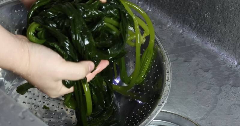 데친 곰피는 바로 찬물에 헹궈 색을 살린다. 이렇게 하면 해조류 특유의 향이 더욱 살아난다. 이후 물기를 가볍게 짜고 먹기 좋은 크기로 잘라 준비한다.