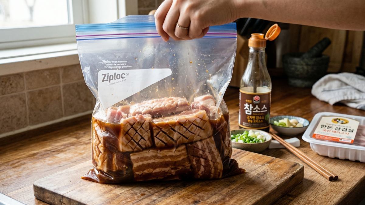 조리 과정은 크게 세 단계로 나뉜다. 첫 번째는 고기를 담는 과정이다. 설거지거리를 줄이고 양념이 골고루 배게 하려면 지퍼백이나 밀폐 용기를 사용하는 것이 좋다. 준비한 돼지고기를 봉투에 차곡차곡 담아준다.