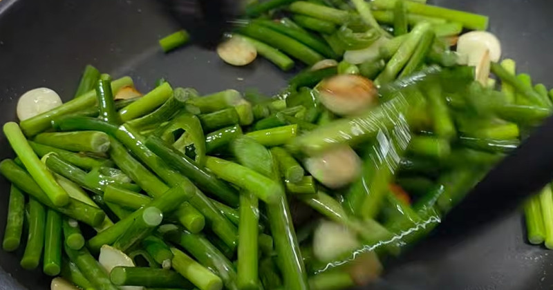 조리 과정도 어렵지 않다. 먼저 마늘쫑을 깨끗이 씻은 뒤 4~5cm 정도 길이로 잘라 준비한다. 팬에 식용유를 두르고 중불에서 마늘쫑을 먼저 볶아 준다. 이때 너무 강한 불에서 볶으면 겉만 익고 속은 질길 수 있으므로 중간 불에서 천천히 익히는 것이 좋다.