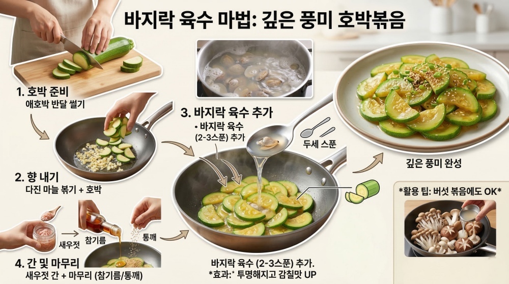 가장 간단하게 활용할 수 있는 방법은 '호박볶음'에 넣는 것이다. 먼저 애호박을 깨끗이 씻은 뒤 너무 얇지 않게 반달 모양으로 썬다. 팬에 식용유를 두르고 다진 마늘을 먼저 볶아 향을 낸 뒤 호박을 넣어 볶는다. 어느 정도 익기 시작하면 여기에 바지락 육수를 두세 스푼 정도 넣어준다. 그러면 호박이 투명해지면서 자연스럽게 감칠맛이 더해진다. 이후 새우젓으로 간을 맞추고 마지막에 참기름을 살짝 두른 뒤 통깨를 뿌리면 완성된다. 바지락 국물이 더해지면 나물 반찬 특유의 담백함에 깊은 풍미가 더해진다.