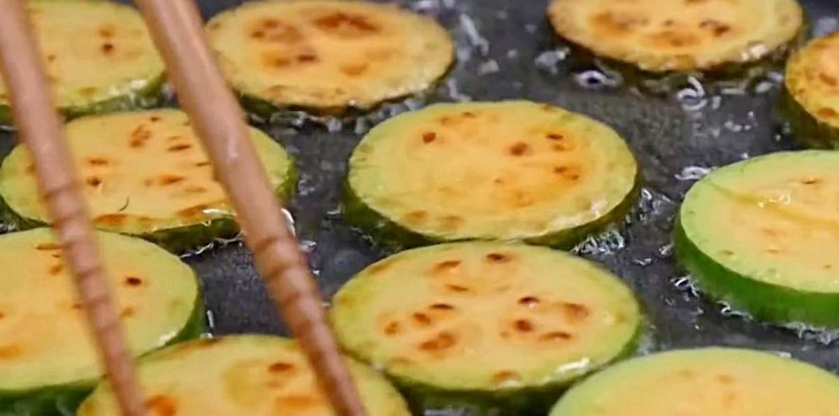 얇게 썬 애호박은 팬에 넉넉하게 두른 기름 위에 올린다. 이때 기름은 팬 바닥이 보이지 않을 정도로 충분히 두르는 것이 좋다. 일반적인 전처럼 얇게 굽는 방식이 아니라 튀기듯 굽는 방식이기 때문이다.