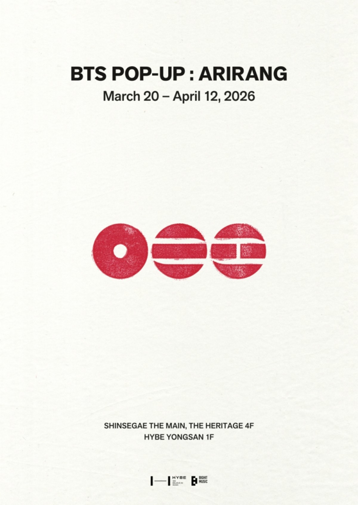 13일 소속사 빅히트 뮤직에 따르면 방탄소년단은 오는 20일부터 4월 12일까지 서울 용산구 하이브 사옥과 신세계백화점 본점 더 헤리티지에서 ‘BTS POP-UP : ARIRANG’을 운영한다. 이번 팝업은 새 정규 앨범 ‘아리랑(ARIRANG)’의 세계관과 메시지를 오프라인 공간에서 경험할 수 있도록 기획됐다.