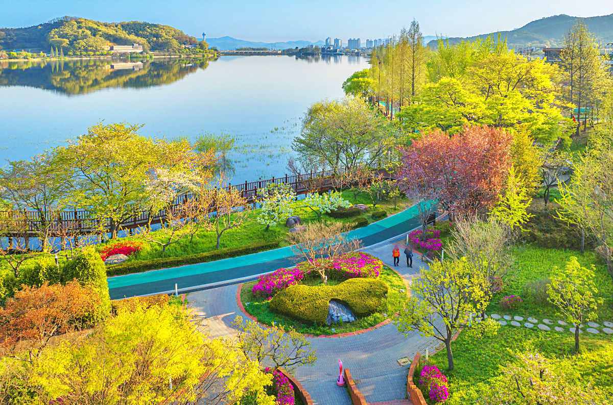 신정호는 지난해 ‘신정호정원’으로 새롭게 단장하며 한층 풍성한 볼거리를 더했다. 신정호정원의 전체 면적은 23만 8648㎡이며, 이 가운데 3만 3543㎡ 규모의 중점 조성지는 ‘물의 정원’을 핵심 주제로 구성됐다. 방문객을 반기는 환영정원을 시작으로, 계절의 변화를 색채로 표현한 사계절 색깔정원, 지형의 단차와 흐름을 살린 다랭이정원, 호수의 정체성을 담아낸 물의 정원, 바람의 결을 느낄 수 있는 산들바람언덕정원, 절제된 분위기의 마른정원까지 6개 테마 공간이 자연스럽게 이어진다. 각각의 정원은 식재 구성과 동선, 시선이 머무는 지점을 다르게 설계해 같은 길을 걸어도 구간마다 분위기가 달라지며, 걷는 과정 자체가 하나의 경험이 되도록 한다.