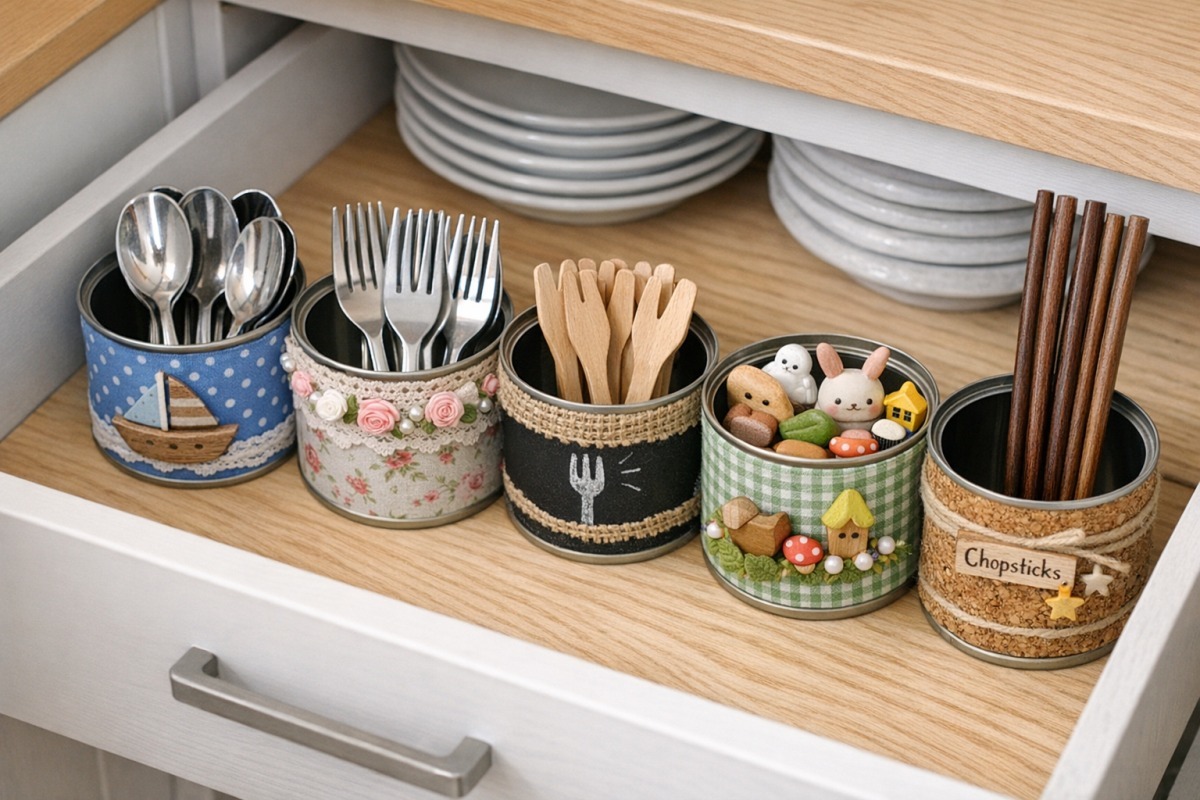 이렇게 깨끗하게 세척한 참치캔은 수납함으로 활용할 수 있다. 서랍 높이에 딱 맞는 참치캔 여러 개를 나열하여 티스푼, 포크, 젓가락 받침대 등 작은 주방 기구들을 종류별로 나누면 된다. 표면은 자신이 원하는 대로 여러 도구를 활용해 꾸미는 것도 좋다.