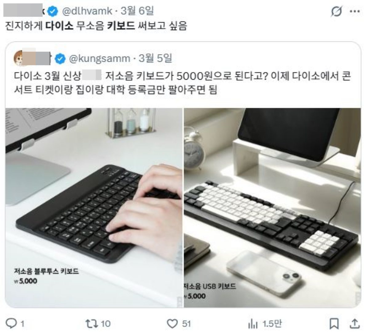 누리꾼들은 “다이소가 이제는 컴퓨터 용품 시장까지 위협한다”, “이 정도 가격이면 생태계 교란범 수준이다”, “중국 직구 제품과 비교해도 가격 경쟁력이 압도적이다” 등의 반응을 보였다.