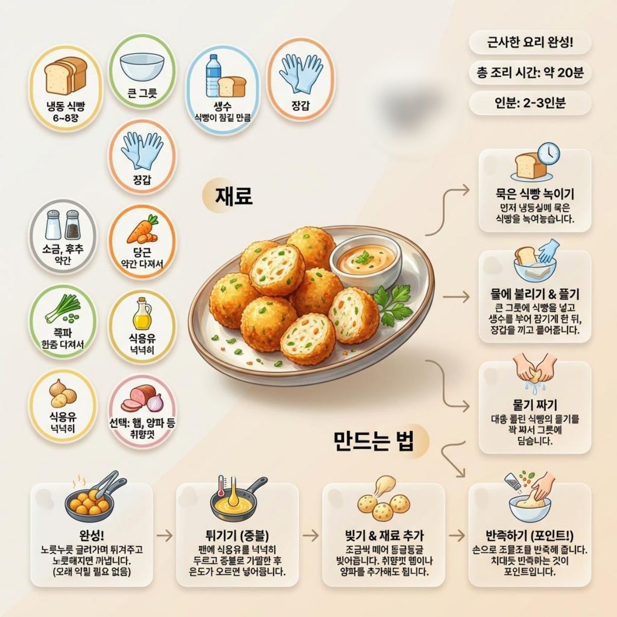 해당 레시피의 가장 중요한 포인트는 '치대듯 반죽하는 것'이다. 양념과 채소가 들어간 식빵 반죽을 손으로 조물조물 치대어 찰기를 만드는 과정이 요리의 완성도를 결정한다. 이때 개인의 취향에 따라 햄이나 양파 등의 재료를 추가로 넣어 풍미의 외연을 넓힐 수 있다.