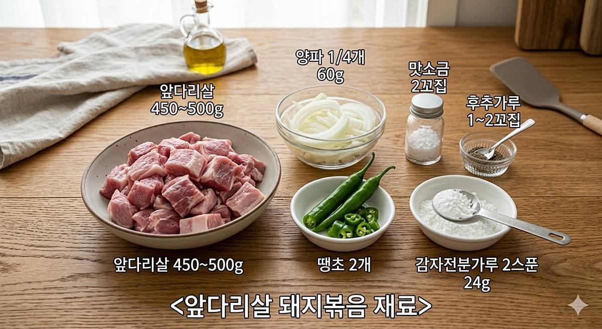 레시피는 먼저 양파 1/4개 60g을 잘게 썰고, 대파 흰대 위주로 20g을 다져 2~3큰술 정도 준비하는 것부터 시작한다. 여기에 아주 매운 땡초 2개도 잘게 썬다. 고기는 수육용 앞다리살 450~500g을 준비해 1.5~2cm 폭으로 썬 뒤 한입 크기로 자른다. 그리고 비닐에 담아 맛소금 2꼬집, 후추가루 1~2꼬집을 넣고 먼저 골고루 밑간한다. 여기까지만 보면 평범한 밑작업처럼 보이지만, 진짜 차이는 다음 단계에서 벌어진다.