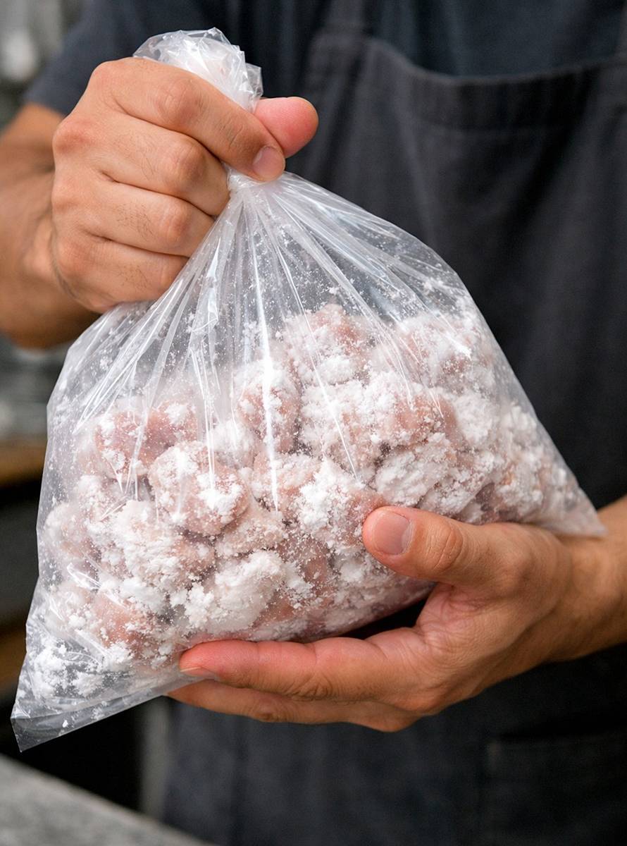 이제 감자전분, 또는 감자전분 함량이 높은 전분 믹스 제품을 2큰술, 약 24g 넣는다. 손으로 치대듯 버무리는 게 아니라, 비닐 입구를 꽉 잡고 흔들어 가루가 안에서 흩날리듯 고기 표면에 고르게 들러붙게 해야 한다. 이렇게 하면 고기 겉면에 얇은 전분막이 생긴다. 이 전분막은 볶는 동안 고기 속 수분과 육즙이 빠져나가는 걸 줄여주고, 양념이 겉에 착 달라붙게 만들어준다. 앞다리살이 퍽퍽하다는 인식을 바꾸는 가장 중요한 포인트가 바로 이 대목이다. 10분 정도만 재워두면 준비는 끝난다.