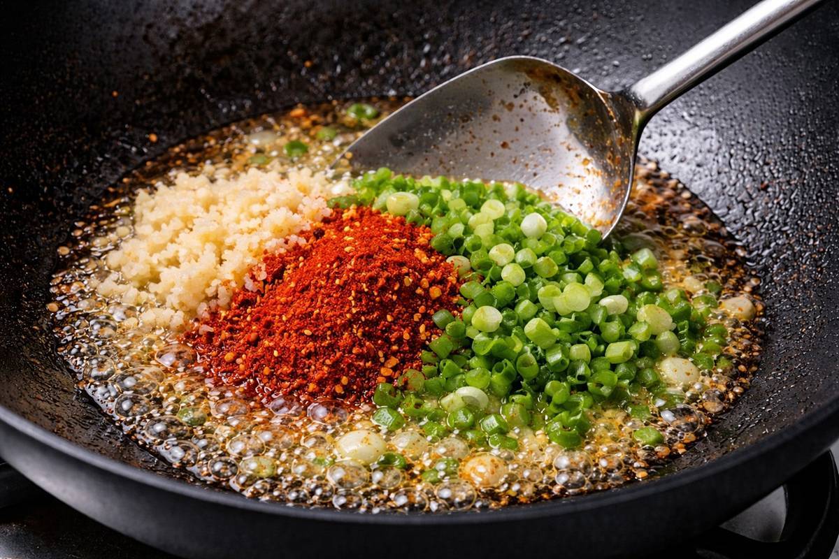 볶는 순서도 중요하다. 웍에 고춧가루 1스푼 7g, 간마늘 1스푼 20g, 다진 대파, 식용유 4스푼 20g을 넣고 강불에서 자글거리게 만든 뒤 곧바로 약불로 줄여 2분 정도 볶아 향을 충분히 끌어낸다. 이때 만들어지는 향기유가 전체 맛의 바탕이 된다. 이후 양파를 넣고 중불에서 1분 정도 더 볶아 단맛과 수분을 보충한 뒤, 전분을 입힌 고기를 넣고 중불로 익힌다. 고기가 80% 이상 익을 때까지 약 2분 30초 정도 볶은 다음, 미리 만들어둔 양념장을 넣고 1분 30초 더 볶는다. 마지막으로 땡초를 넣고 강불로 올려 30~40초만 더 볶으면 매운 향과 불맛까지 살아 있는 앞다리살 볶음이 완성된다.